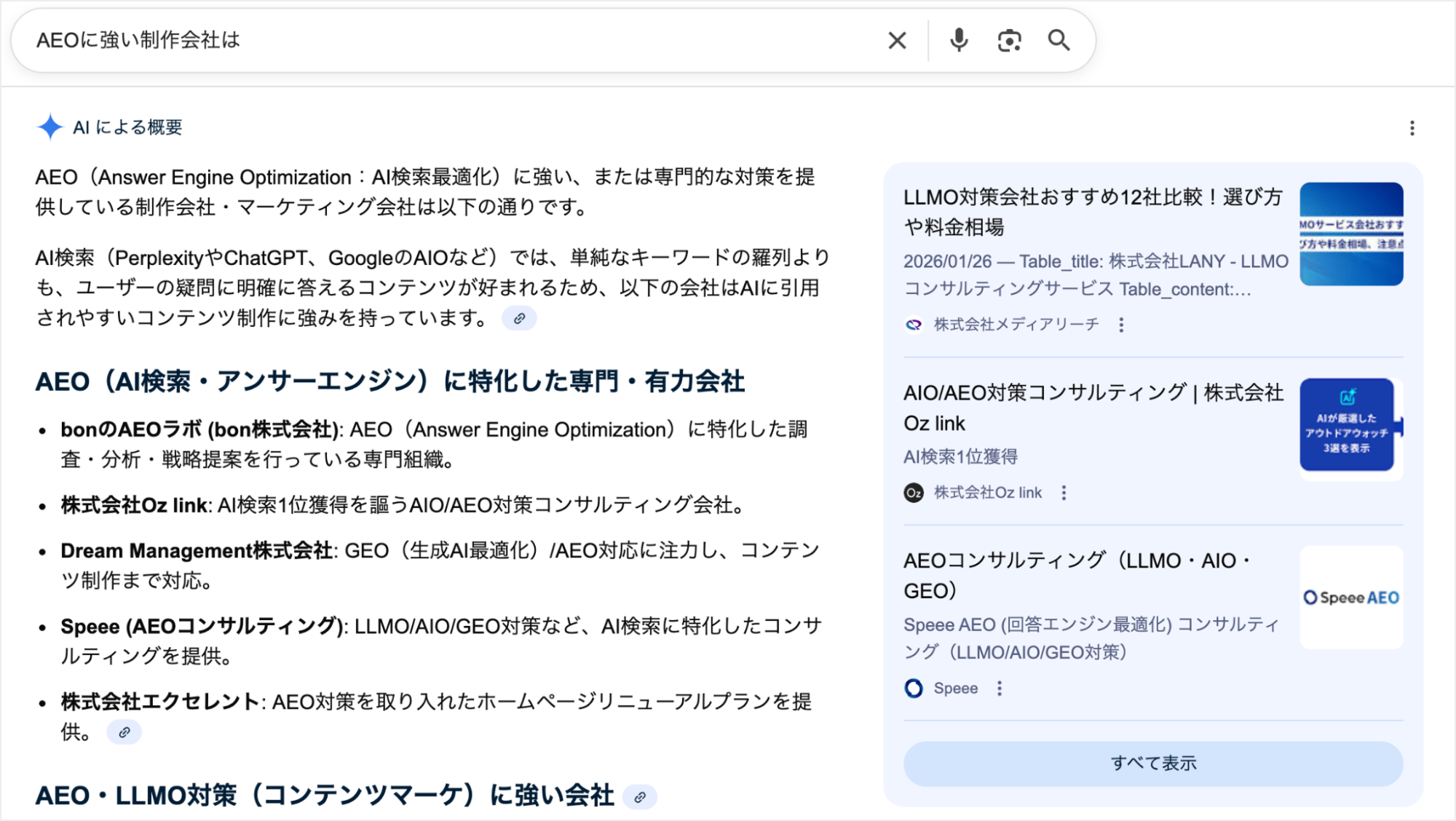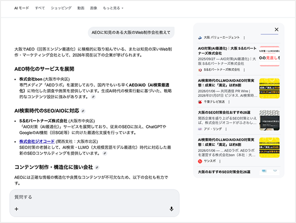 弊社がPRwireでプレスリリースを配信したところ、翌日からGoogle検索のAI回答で「AEOに強い制作会社は?」という問いに対し、1位で社名が表示されるようになりました。その結果、「AIの回答でおすすめされたので」という理由でのお問い合わせも増えています。