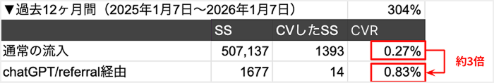 さらに注目すべきは、ChatGPT経由のアクセスでは通常の流入と比べて問い合わせ率が約3倍になった点です。AIにメンションされる状態を作ることで、態度変容が起きやすいユーザーからのアクセスが期待できることが分かりました。