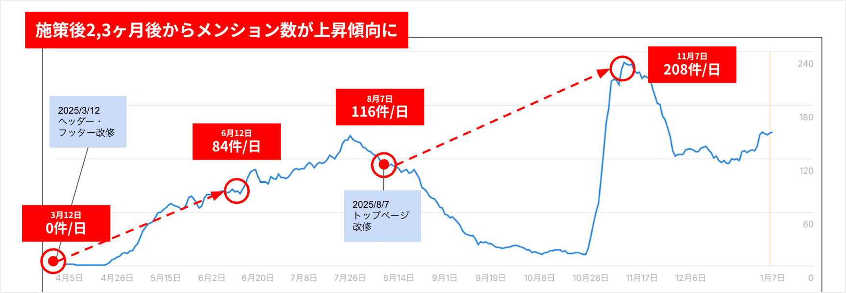 コンセプトをフッターとトップページに反映し、約1ヶ月後からAIからのメンション数が上昇。施策前は0件/日だったメンション数が、約8ヶ月後には208件/日まで増加しました。