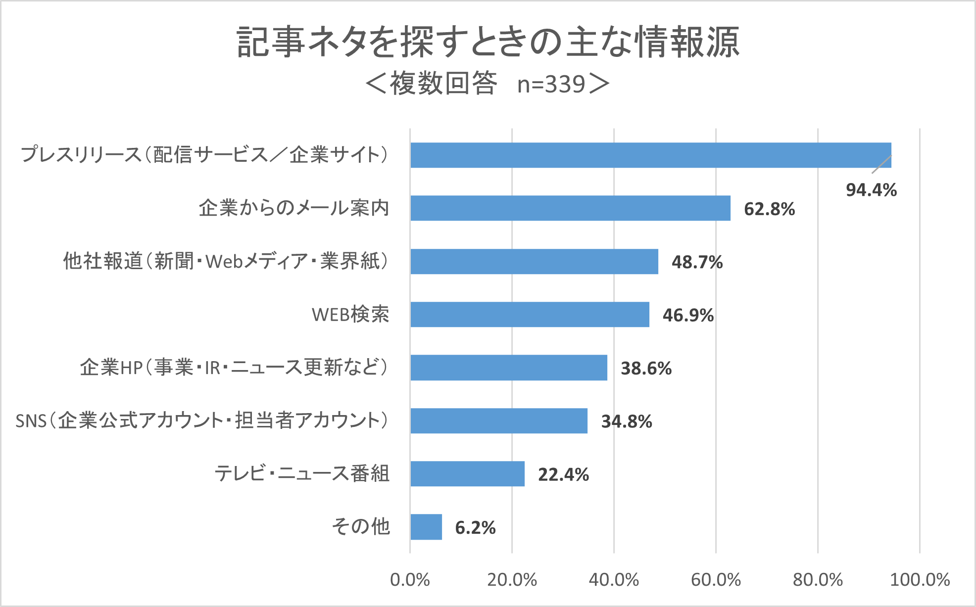 メディア担当者が記事や取材のネタを探す際の情報源は「プレスリリース」が圧倒的に多い、9割超えの結果となりました(配信サービスや企業サイトからの配信を含む)。