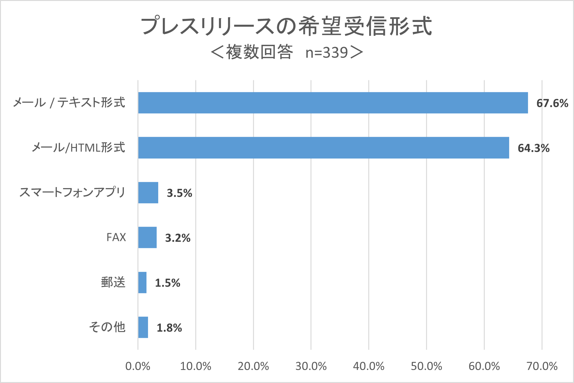 設問「現在、FAXとテキスト・HTML形式の電子メールでプレスリリースをお送りしています。今後はどのような形式での受信を希望されますか?」について、上位3回答は以下のような結果でした。