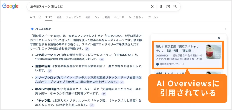 - さらに、配信したプレスリリースがGoogleのAI Overviewsに引用された実績も確認されています。