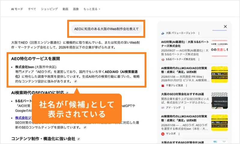 - 配信翌日から、Google系AI(AI Overviews/Gemini/AIモード)の回答内容に変化が見られ、社名が候補として提示されるようになりました。