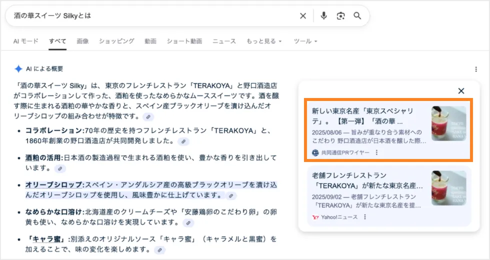 - さらに、配信したプレスリリースがGoogleのAI Overviewsに引用された実績も確認されています。