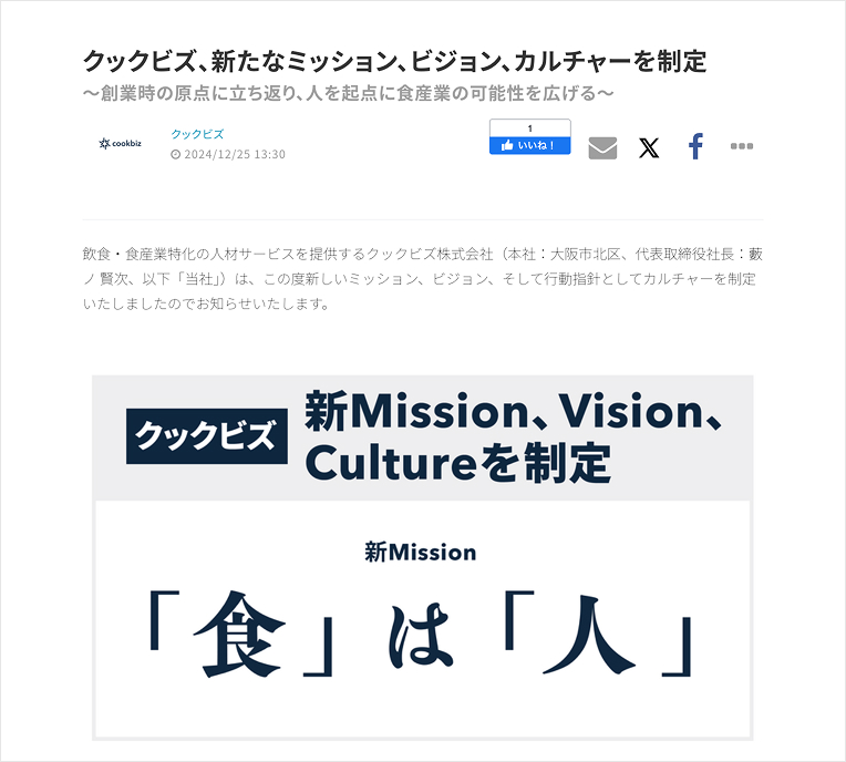 本記事では、ミッション・ビジョン・バリュー(MVV)とは何かをはじめ、MVVを策定するポイントや浸透させる方法について、MVC(※)策定時に共同通信PRワイヤーのプレスリリースを活用したクックビズ株式会社の好事例と共に解説します。