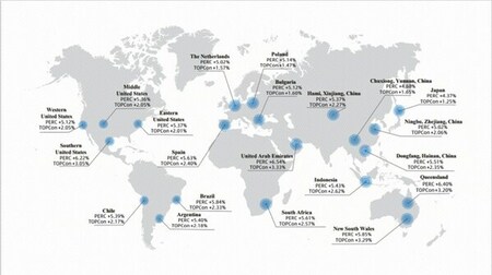 HJT製品は、本質的に高い発電量を特徴とします。ライセンエネルギーは、図1に示すように、典型的な気候環境を持つ世界20以上の国・地域でシミュレーションを行い、HJT Hyper-ionモジュールの発電量をPERCモジュールやTOPConモジュールと比較しました。シミュレーションの結果、HJTモジュールは、さまざまな地域において、TOPConモジュールやPERCモジュールと比較して、一貫して大幅な発電量の増加を示していることがわかりました。特に高温地域では、卓越した性能を発揮しています。