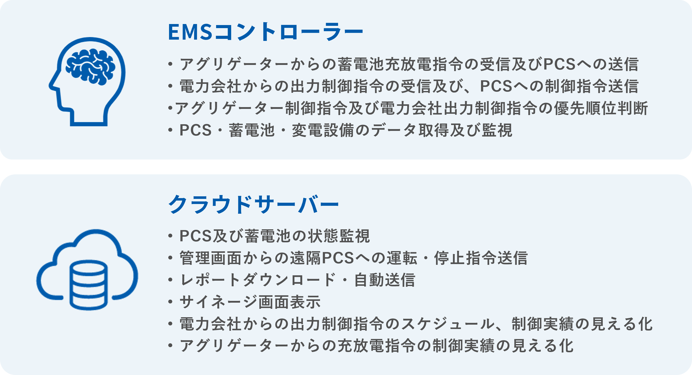 電力会社からの出力制御指令とアグリゲーターからの充放電指令、PCS・蓄電池データを管理し、適切な制御を行います。