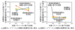 さらに、災害廃棄物処理に関わるパラメータ(既設処理施設の安全性、仮設処理施設の設置に要する時間および処理能力、道路網の交通容量)に対する感度解析※7を行い、図-1に示す結果を得ました。図-1は、道路ネットワーク上の橋梁の耐震性が高いおよび低い場合に、対象パラメータに乗ずる係数と、地震発生から500日後までに災害廃棄物の処理が完了する確率の関係を示しています。図-1より、同じ災害廃棄物対策を施した場合でもその効果は、橋梁の耐震性が高く震災後も車両が道路ネットワークを通行しやすいほど、高いことが分かります。この結果は、災害廃棄物処理のマネジメント手法を確立するためには、廃棄物処理システムおよび橋梁・道路ネットワークの管理者が連携して、震災前に対策を講じる必要性を示しています。