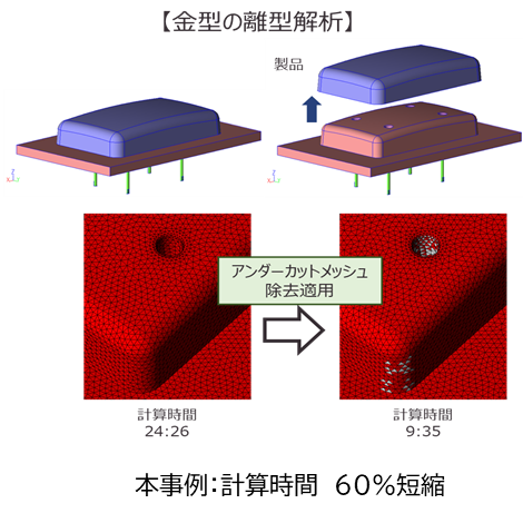 鋳 造工程では、製品を金型からスムーズに取り出す「離型性」の良し悪しが製品品質や歩留まりに直結します。離型性の評価にあたり、解析上の課題はアンダーカット形状です。離型方向に対して角度のある面は干渉しやすく、現実には起こりえない破損や変形の原因となるため、解析ノウハウとして高度な対策が重要です。新バージョンでは、メッシュ上で不要な接触面を自動除去する機能を搭載しました。離型時に干渉する可能性のあるアンダーカット部分を解析対象から除外することで、解析時間を大幅に短縮します。これにより、安定的な解析と試行回数の増加に期待できます。