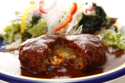 上州牛と上州麦豚あいびきのふっくらジューシーなハンバーグの中にモッツァレラチーズを入れ、自家製デミグラスソースと合わせて真空調理された大人気のチーズインハンバーグです。