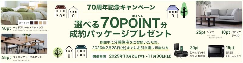 大和ハウス工業株式会社の分譲住宅を2025年10月2日(木)~11月30日(日)までに、土地建物売買契約を締結していただき2026年2月28日(土)までに引き渡し可能な方。選べる70ポイント分の成約パッケージをプレゼント。