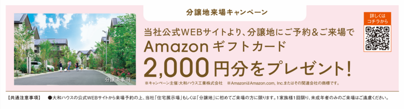 大和ハウスの公式WEBサイトから「分譲地」にご予約の上、ご来場いただいた方に「Amazonギフトカード2,000円分」をプレゼントします。
