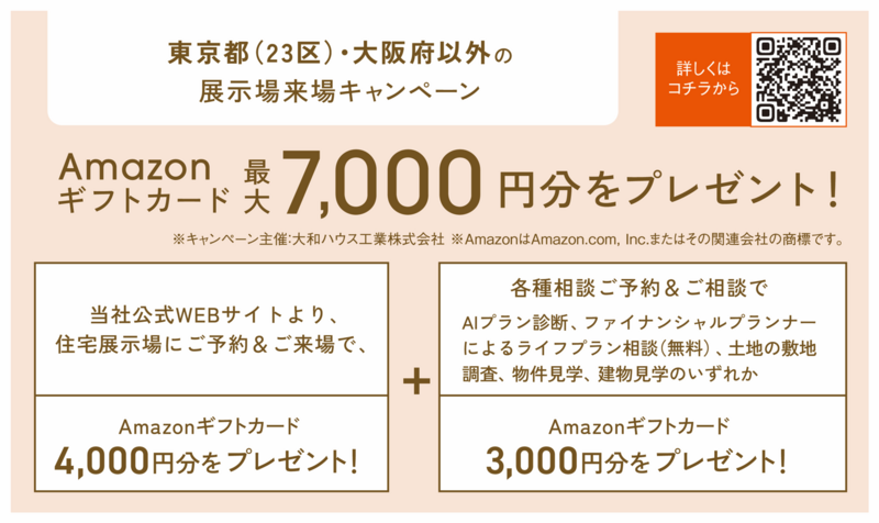 ① 展示場来場キャンペーン(住宅フェア):Amazonギフトカード※1 最大7,000円分プレゼント