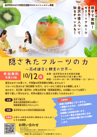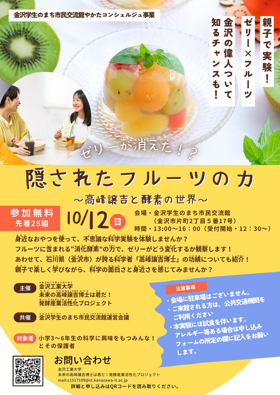 金沢工業大学 バイオ・化学部 生命・応用バイオ学科の学生による「未来の高峰譲吉博士は君だ! 発酵産業活性化プロジェクト」では、このたび、「【親子で実験】隠されたフルーツの力~高峰譲吉と酵素の世界~」を10月12日(日)13時から16時まで金沢学生のまち市民交流館(金沢市片町2丁目5番17号)で開催します。