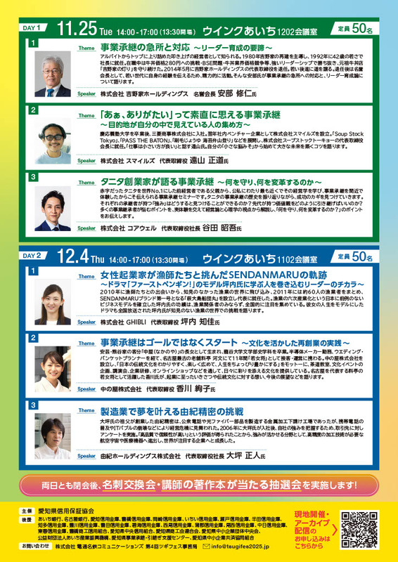 ■後援 :あいち銀行、名古屋銀行、愛知信用金庫、豊橋信用金庫、岡崎信用金庫、いちい信用金庫、瀬戸信用金庫、半田信用金庫、知多信用金庫、豊川信用金庫、豊田信用金庫、碧海信用金庫、西尾信用金庫、蒲郡信用金庫、尾西信用金庫、中日信用金庫、東春信用金庫、豊橋商工信用組合、愛知県中央信用組合、愛知県商工会連合会、愛知県中小企業団体中央会、公益財団法人あいち産業振興機構、愛知県事業承継・引継ぎ支援センター、愛知県中小企業共済協同組合