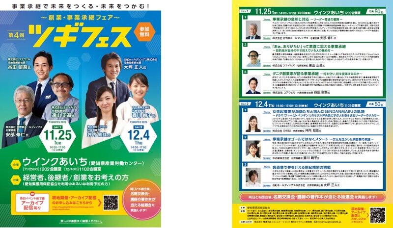 2025年11月25日(火)・12月4日(木)の2日間、事業承継・創業をお考えの方を対象とした創業・事業承継フェア「第4回ツギフェス」をウインクあいち(愛知県産業労働センター)にて開催いたします。
