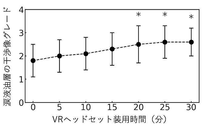 スマートフォンやパソコンで目を酷使するデジタル社会では、眼精疲労やドライアイになる人が増えています。本研究では、今後普及が見込まれるVRヘッドセットに超小型カメラを搭載し、健常成人の30分間のVRセッション中の涙液油層を非侵襲、かつ経時的に観察しました。時間とともに涙液油層の干渉像グレードが増加し、他の涙液指標および自覚症状スコアには有意な変化は認められませんでした。この結果から、短時間のVRヘッドセットの使用によって涙液油層が厚くなり、涙液層の安定性が向上した可能性が示唆されました。今後は、ヘッドセットを装用しない対称群を含む検討により一般化の可能性を検証し、機器の安全使用と目の健康につながる研究を進めていきます。
