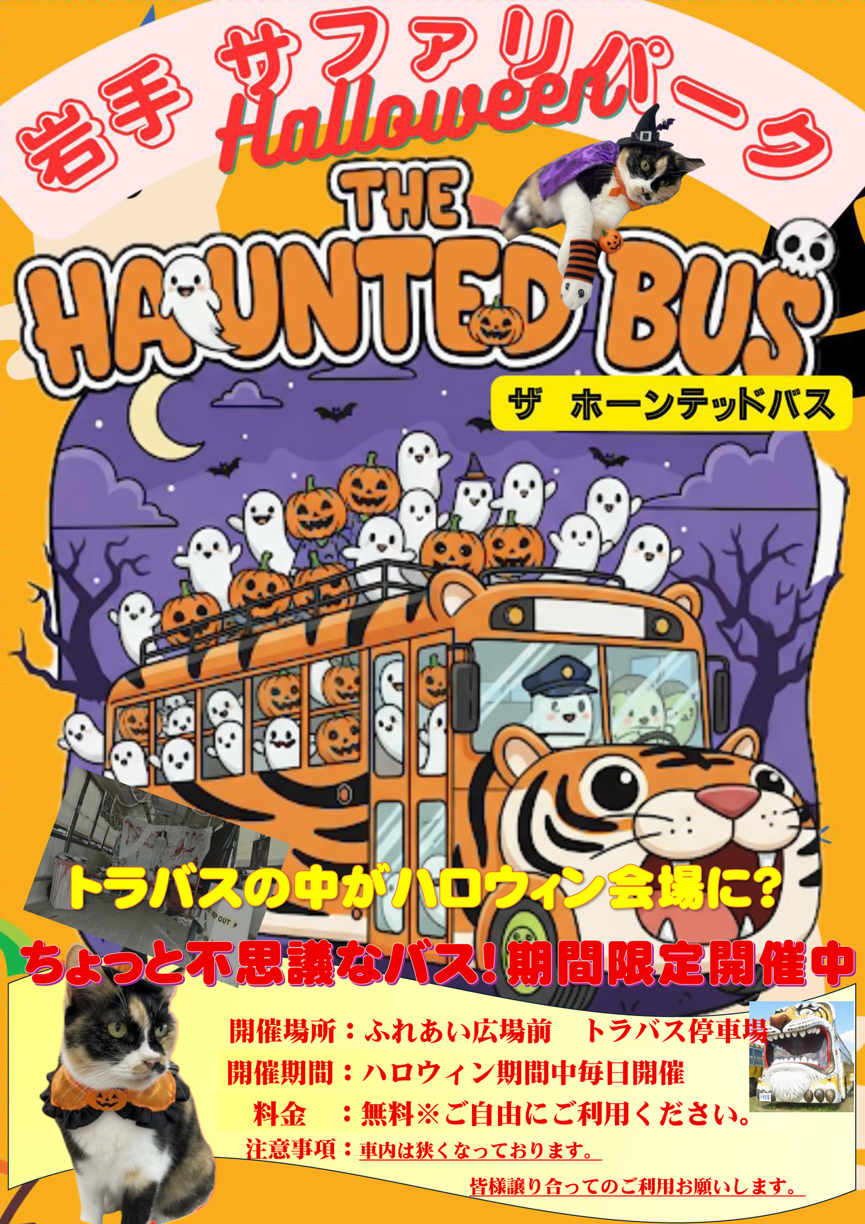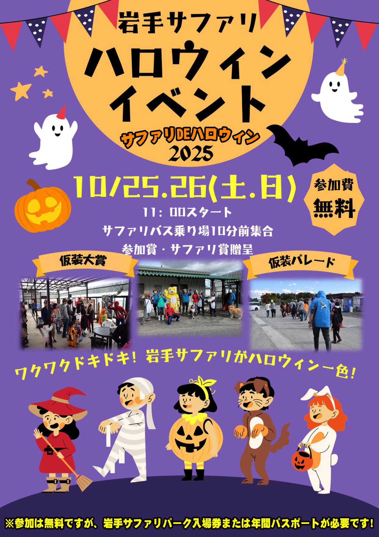 10月2日(木)から10月31日(金)まで「サファリDEハロウィン2025」と題して、フォトスポット・ホーンテッドバスの設置やお子様限定謎解きウォークを開催、10月25日(土)と10月26日(日)の2日間に限り一部仮装、全身仮装でご来園のお客様は入場料金がなんと半額になります。また、同日限定で仮装パレードと仮装大賞を開催します。ようやく酷暑も去って、過ごしやすくなった岩手の秋を皆で楽しみましょう!