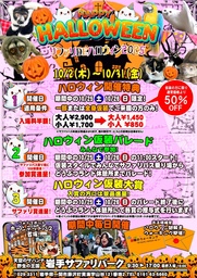 また、特典として10月25日(土)と10月26日(日)の2日間に限り一部仮装、全身仮装でご来園のお客様は入場料金が半額になります。同日限定でお客様と当園スタッフによる仮装パレード及び仮装大賞を開催します。参加特典や仮装大賞入賞者の方には景品の進呈もあります。
