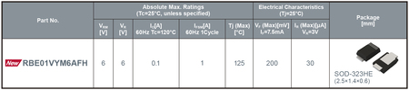RBE01VYM6AFH: https://www.rohm.com/products/diodes/schottky-barrier-diodes/ultra-low-vf/rbe01vym6afh-product