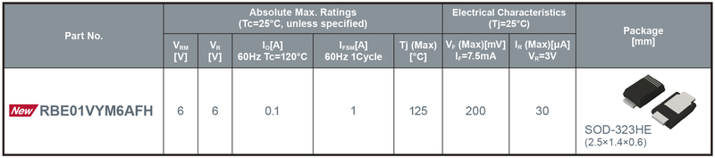 The diode is housed in a compact flat-lead SOD-323HE package (2.5 mm x 1.4 mm / 0.098 inch x 0.055 inch) that offers both space efficiency and excellent mountability. The RBE01VYM6AFH is also AEC-Q101 qualified, ensuring suitability as a protection device for next-generation automotive electronics requiring high reliability and long-term stability.