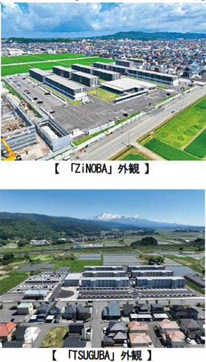 「ZiNOBA」(秋田県由利本荘市、2023年4月開業)と「TSUGUBA」(秋田県にかほ市、2024年4月開業)は、住居棟と共用棟で構成される、TDK株式会社の社員寮です。