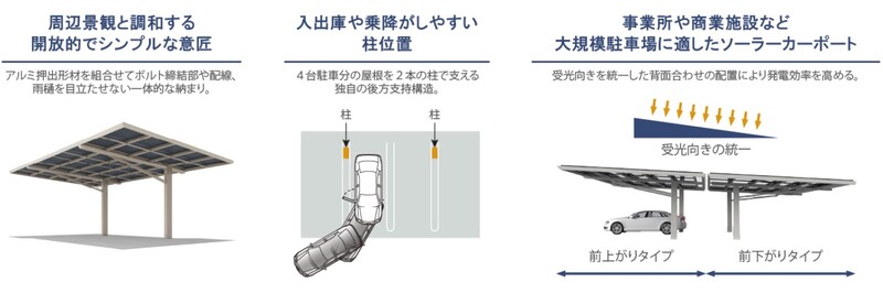 「DREAM Port」は、事業所や商業施設、工場などの建物の景観に溶け込むデザインを採用したソーラーカーポートです。