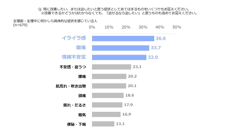 また、特に改善したい項目を聞いたところ、最も多いのは「イライラ感(36.6%)」次いで「腹痛(33.7%)」でした。全体的に見ても身体的・精神的症状の両方が挙がっていることからも、多岐にわたる悩みを抱えていることがわかります。