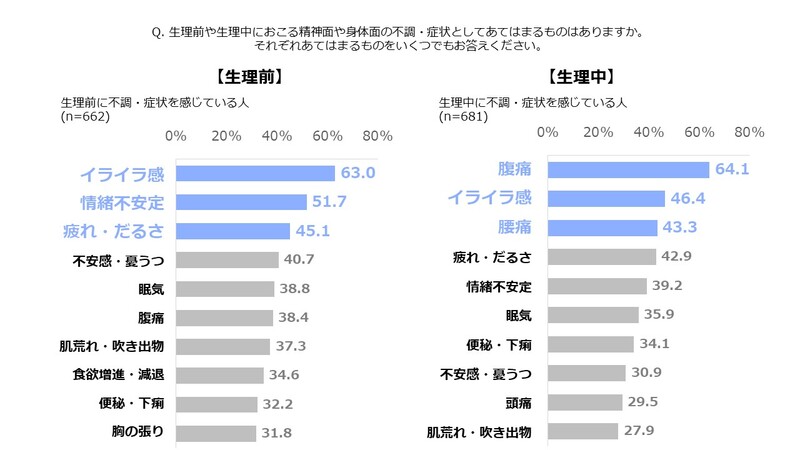 生理前や生理中におこる精神面や身体面の不調・症状について、複数回答で聞いたところ、生理前は「イライラ感(63.0%)」が最も多く、次点は「情緒不安定(53.7%)」でした。生理中では「腹痛(64.1%)」が最も多く、次点は「イライラ感(46.4%)」でした。