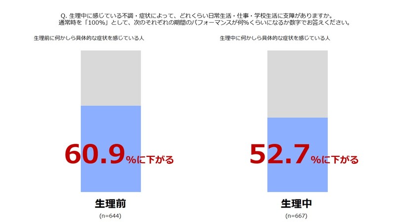 「生理前や生理中の不調・症状によって、通常時100%のパフォーマンスが何%になるか」を聞いたところ、全体平均が生理前で60.9%、生理中で52.7%となり、約4~5割程度パフォーマンスが落ちることがわかりました。生理前や生理中の不調・症状が、プレゼンティーズムに影響していることが推察されます。