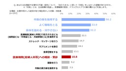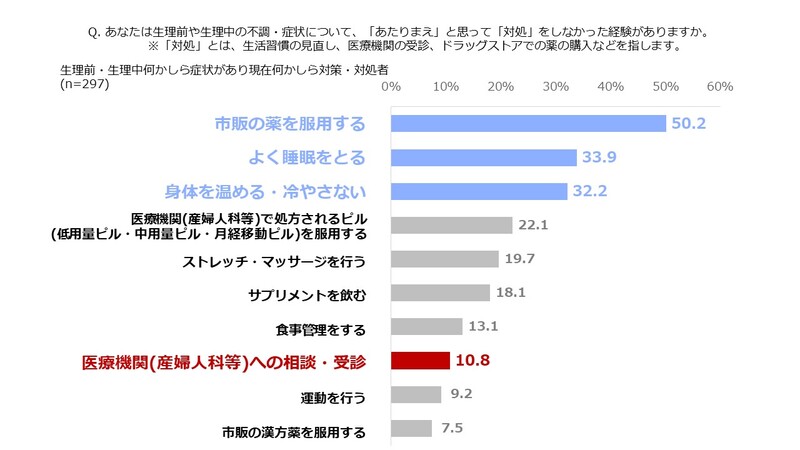 現在行っている対策方法の上位3つは「市販の薬を服用する(50.2%)」「よく睡眠をとる(33.9%)」「身体を温める・冷やさない(32.2%)」といったセルフケアが中心でした。
