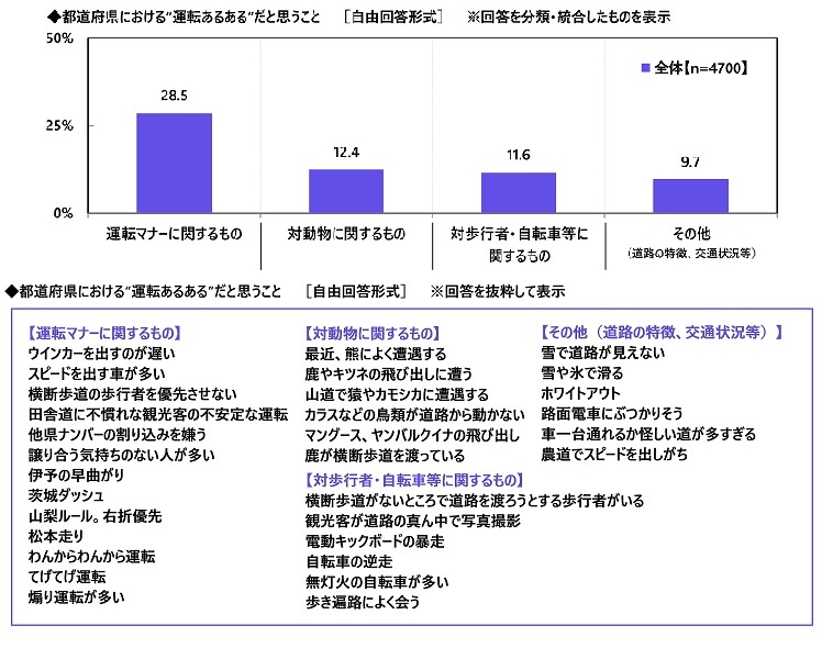 自身が住む都道府県における“運転あるある”だと思うことを聞いたところ、北海道では「鹿やキツネの飛び出しに遭う」、青森県や島根県では「鹿の飛び出しに遭う」、兵庫県や山口県では「鹿やイノシシの飛び出しに遭う」、奈良県では「鹿が横断歩道を渡っている」など、動物に関する“あるある”が多くみられました。また、宮城県では「信号のない横断歩道で止まらない」、栃木県や新潟県、富山県では「横断歩道に人がいても止まらない」、石川県や和歌山県、鳥取県、岡山県、香川県、宮崎県では「ウインカーを出すのが遅い」、三重県では「スピードを出す車が多い」、滋賀県では「湖岸道路は飛ばしがち」、広島県では「路面電車にぶつかりそうになる」、大分県では「狭い道で減速しない車がある」など、重大事故につながるリスクが高い“あるある”もみられました。そのほか、「茨城ダッシュ」(茨城県)や「山梨ルール」(山梨県)、「松本走り」(長野県)、「名古屋走り」(愛知県)、「伊予の早曲がり」(愛媛県)など、地名のついた“あるある”も回答として挙がりました。