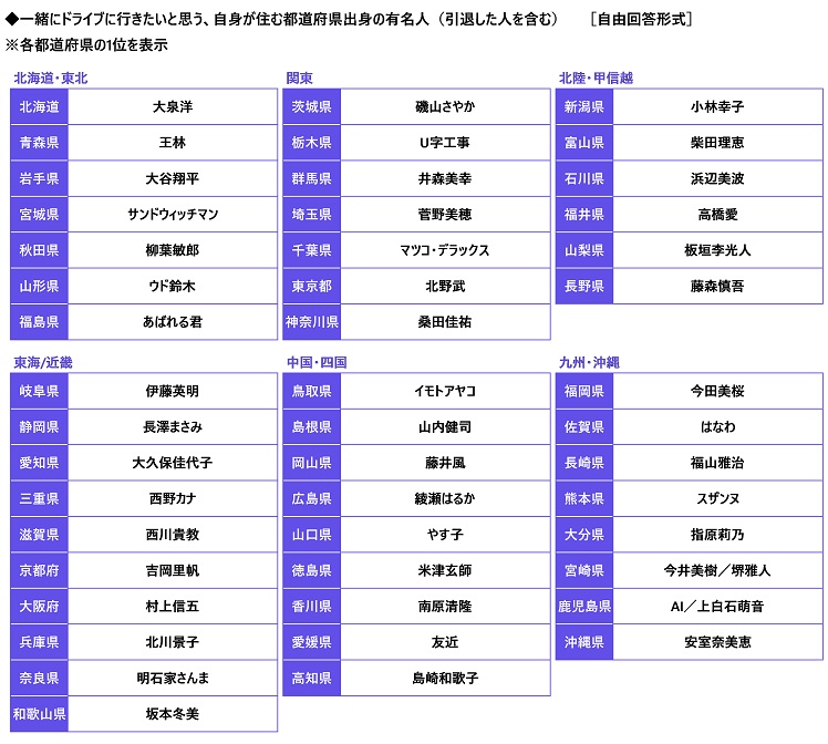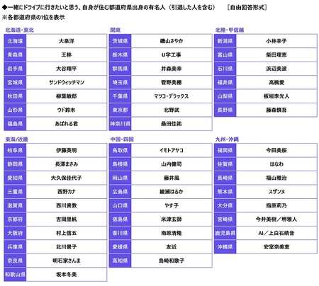 ・一緒にドライブに行きたい自県出身の有名人 都道府県別の1位は?