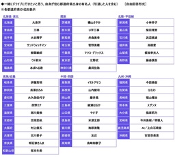 北海道「大泉洋さん」、青森県「王林さん」、群馬県「井森美幸さん」、千葉県「マツコ・デラックスさん」、富山県「柴田理恵さん」、静岡県「長澤まさみさん」、京都府「吉岡里帆さん」、大阪府「村上信五さん」、鳥取県「イモトアヤコさん」、徳島県「米津玄師さん」、長崎県「福山雅治さん」、大分県「指原莉乃さん」