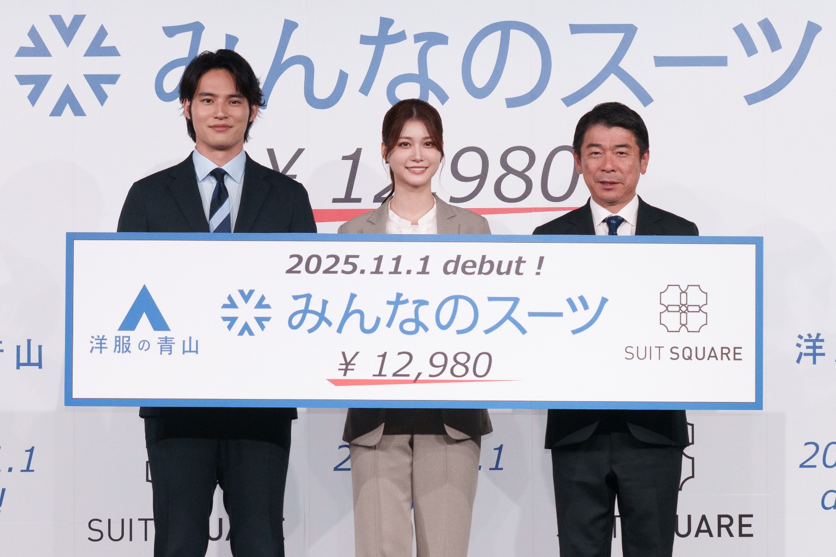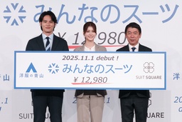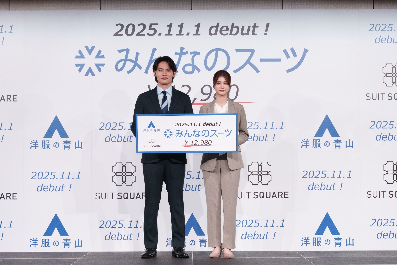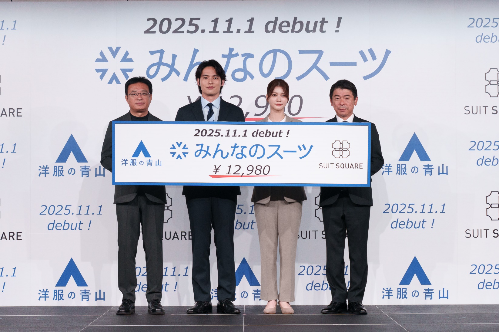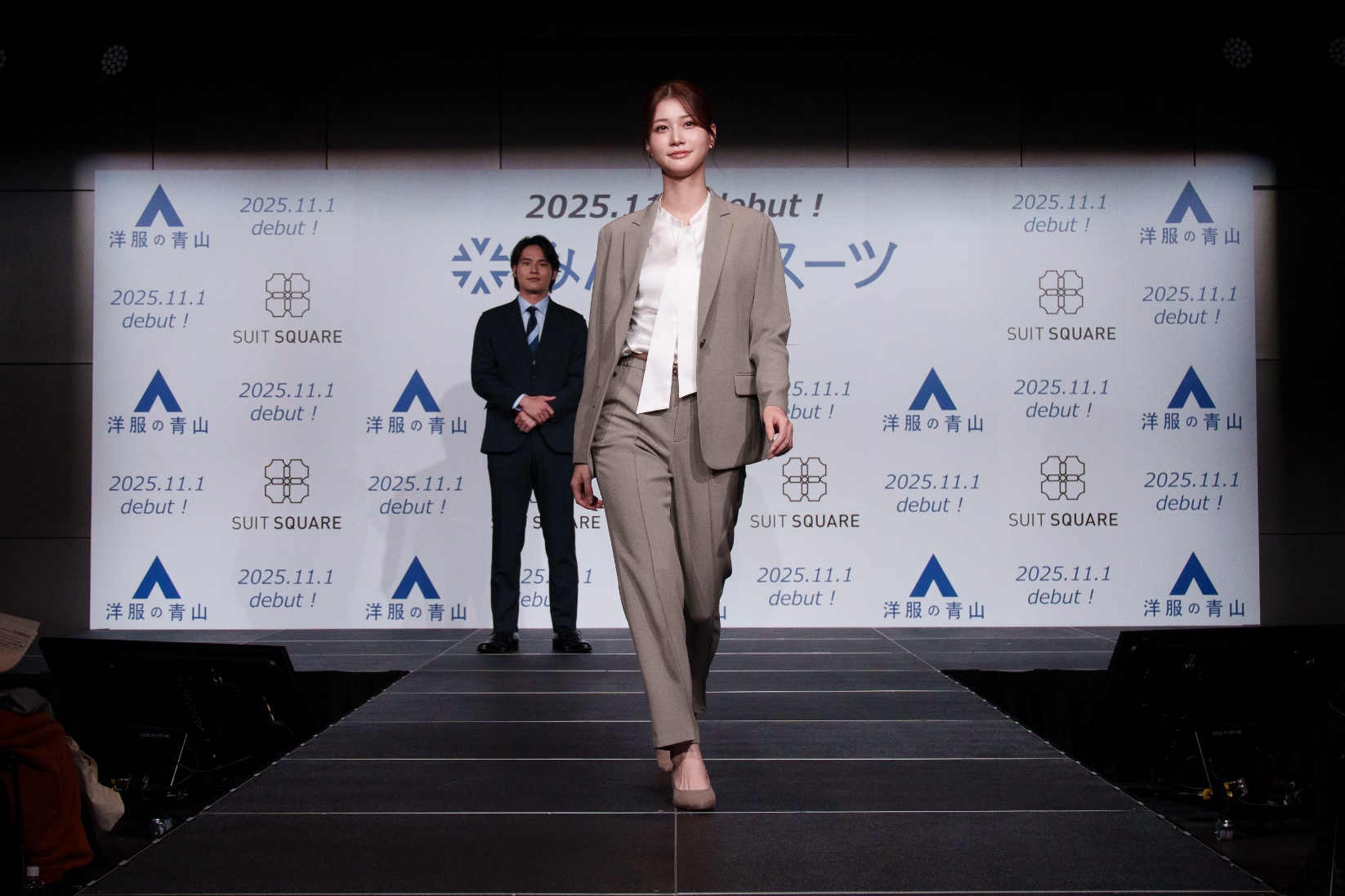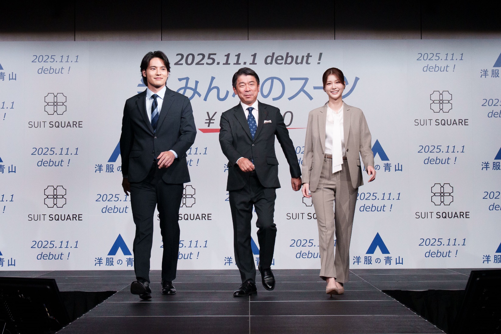 青山商事株式会社(本社:広島県福山市/代表取締役社長:遠藤 泰三)は、「洋服の青山」および「スーツスクエア」で発売する新シリーズ「みんなのスーツ」の立ち上げを記念し、2025年10月22日(水)、東京都港区のP.O.南青山ホールにて「洋服の青山/スーツスクエア 新商品・新キャラクター・新CM発表会」を開催いたしました。