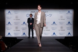 水上さんはネイビースーツ、生見さんはベージュのスーツで登場し、ランウェイウォーキングを披露しました。柔らかな照明の中、二人がすれ違うシーンでは会場から拍手が起こり、新シリーズのコンセプト「すべての人に、似合うスーツを。」を体現するステージとなりました。