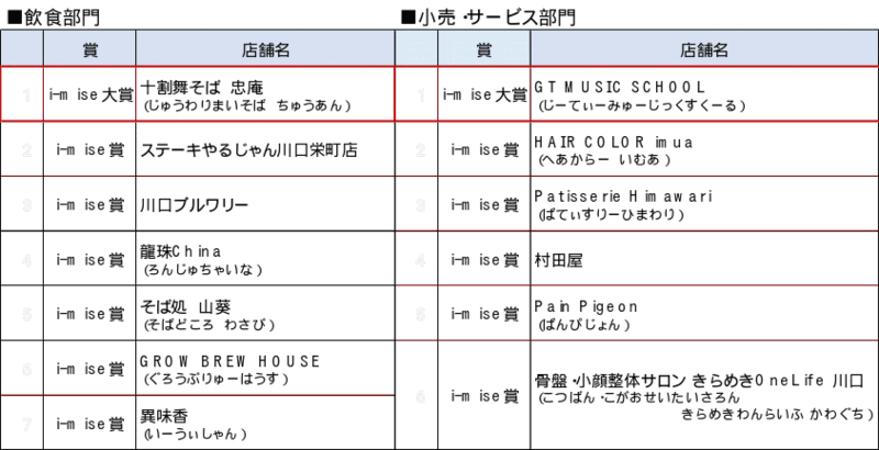 7月から8月にかけて実施した市民投票10,052票の中から、13店舗の受賞店を決定いたしました。飲食部門の大賞は日本蕎麦屋の『十割舞そば 忠庵』、小売・サービス部門の大賞は音楽教室の『GT MUSIC SCHOOL』です。推しコメントでは、商品・サービスはもちろんスタッフの人柄等、お店のファンになった方の熱いコメントが多く見られました。