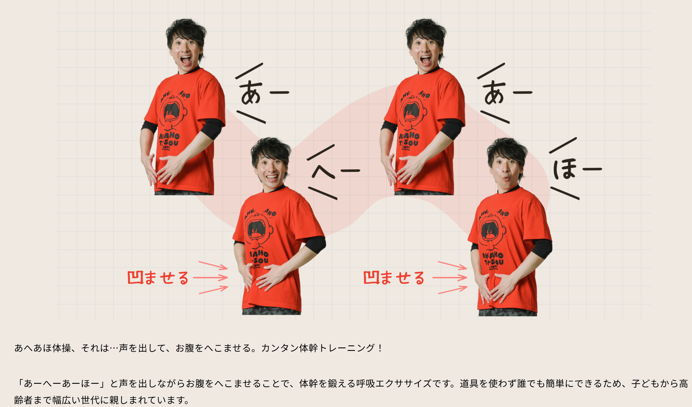 「あへあほ®体操」は、2007年に北海道札幌で誕生した体幹トレーニング法です。