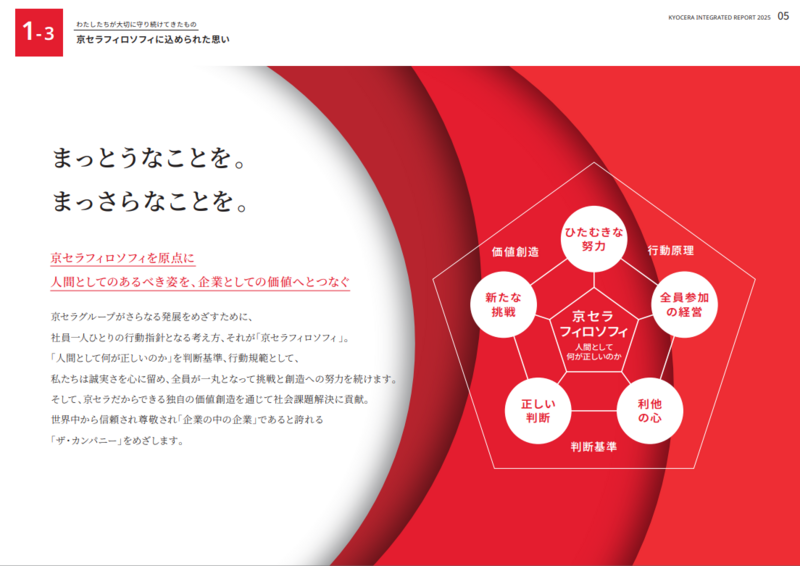 2025年版では、京セラの原点である「人間として何が正しいのか」を判断基準、行動規範とする経営哲学「京セラフィロソフィ」に焦点を当てています。京セラフィロソフィの理解と実践、今後の成長戦略に関する社長インタビューをはじめ、京セラグループが幅広く展開するサステナブルな製品・技術、経営資源で最も重要と位置づける人的資本の充実、さらに環境負荷低減として、カーボンニュートラルの実現に向けた活動などをまとめています。