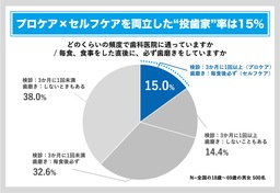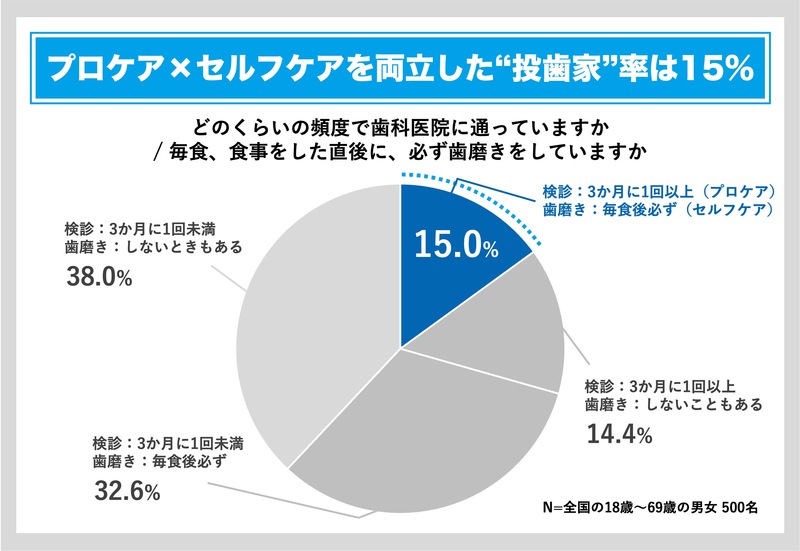 | ●投歯家率(正しく口腔ケアに取り組めている人の割合)はわずか15% ‐プロケア(歯科専門家による口腔ケア)とセルフケアの両方で口腔ケアを実践している人はわずか15% ‐「必要性を感じない」「治療費が高いイメージ」などの理由から歯科医院に通わない人が多数