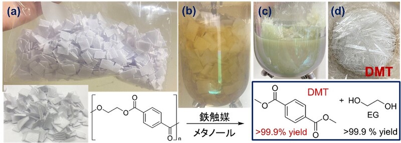 ・ アルコールと混合・加熱するだけで、ポリエステルを高純度の化学原料にほぼ100パーセント変換可能で、かつ、安価で入手容易な高性能鉄触媒を開発した。