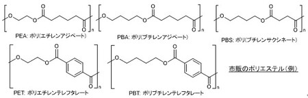 アルコールの水酸基(ROH)とカルボン酸のカルボキシ基(R'COOH)とが脱水することで生成する化学結合(R'COOR)をエステル結合といい、エステル結合を繰り返し単位とする重合体(ポリマー)をポリエステルという。以下に代表的な化学構造を示す。