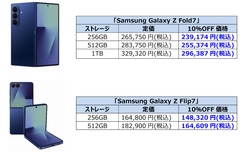 割引内容① 「Samsung Galaxy Z Fold7」、「Samsung Galaxy Z Flip7」が税込金額から10%OFF