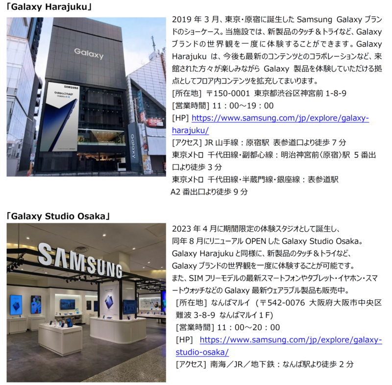 なお、Galaxy Harajuku(東京・原宿)およびGalaxy Studio Osaka(大阪・なんば)では、最新スマートフォン4製品を対象としたキャンペーンを実施いたします。販路によりキャンペーン内容が異なりますので詳細はリリース下部、各キャンペーン概要およびキャンペーンページをご確認ください。ぜひこの機会にSamsung Galaxy製品をご検討ください。