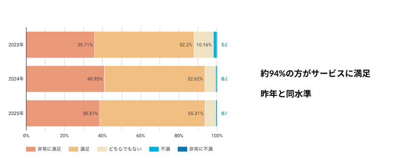 顧客満足度アンケートの結果、リカバリーの訪問看護サービスに「非常に満足」「満足」と回答した方は、2024年同様に約94%となりました。