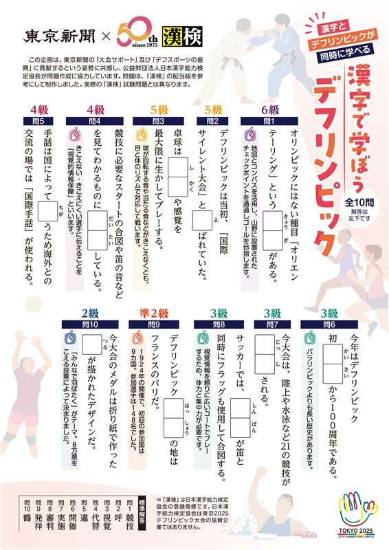 11月15日から開幕する“耳がきこえない・きこえにくい”アスリートによる国際スポーツの祭典「東京2025デフリンピック」のトータルサポートメンバーである東京新聞(中日新聞東京本社:千代田区内幸町/代表:大場司)に公益財団法人 日本漢字能力検定協会(本部:京都市東山区/代表理事 理事長:山崎信夫/以下、漢検協会)が協力し、デフリンピックの魅力を多くの方に知っていただき、デフスポーツへの関心を高めることを目的に「デフリンピック漢字検定」を制作しました。