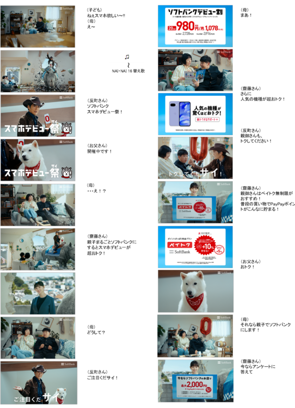 さらに、ソフトバンクショップのクルー役として齋藤さんも登場。CM楽曲には、シブがき隊の名曲「NAI・NAI 16」を「スマホデビュー祭」仕様にした替え歌を使用し、“サイ”尽くしのユーモアあふれる映像に仕上がりました。同日には、スマホデビューについて悩む親子のもとへサイに乗って突入した反町さんと齋藤さんが、「ソフトバンクデビュー割」の魅力を解説するウェブCM「スマホデビュー祭 お宅訪問」篇もYouTubeチャンネルで公開します。