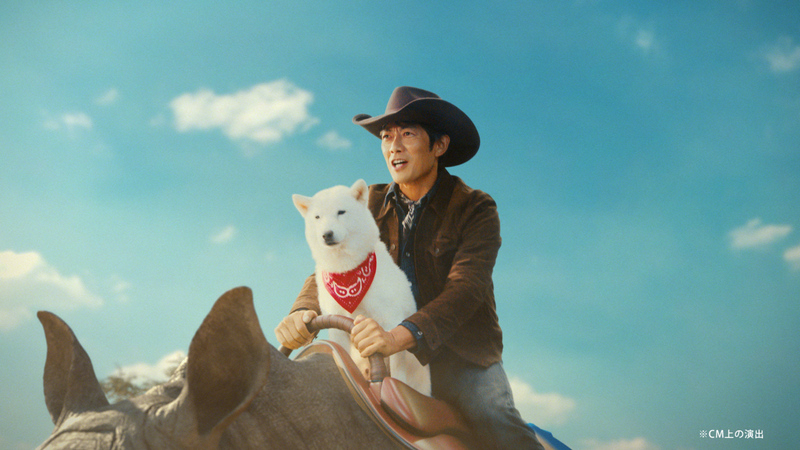 新テレビCMでは、カウボーイ姿の反町さんがサバンナをサイに乗って駆け抜けるシーンからスタートします。