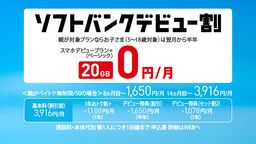 「ソフトバンクデビュー割」は、5~18歳のお客さまを対象に「スマホデビュープラン+」の「ベーシック」(データ容量20GB)をこれまで以上におトクな料金で提供するキャンペーンです。「ソフトバンクデビュー割」では、5~18歳のお客さまの場合に、「ベーシック」の半年間の月額料金を税抜き980円(1,078円)※2にする各種割引に加えて、ご家族が対象プランを契約している場合、さらに税抜き980円(1,078円)割引となり、半年間0円※1でご利用いただけます。
