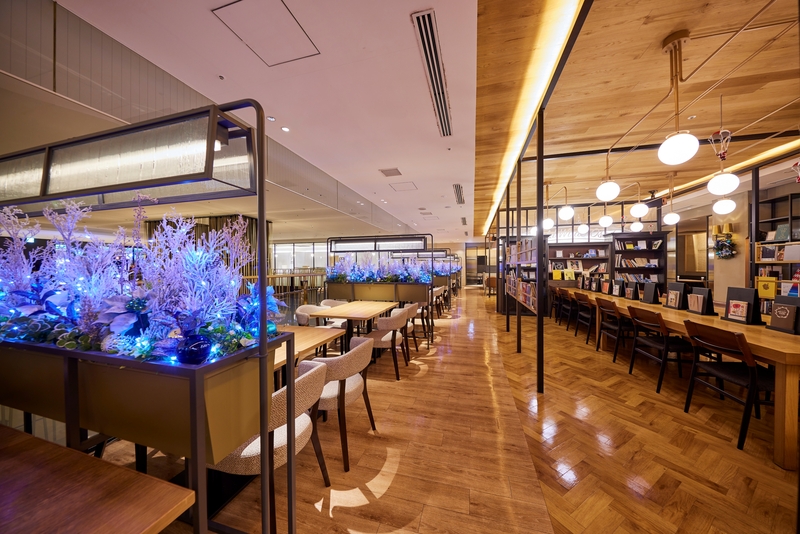 店内の装飾グリーンは、青系のポインセチアと雪が積もったような枝ぶりを組み合わせ、青・ライトブルー・シルバーのボールオーナメントで彩り、冬らしい清らかさを感じる空間に仕上げました。また、店内入口にはクリスマスツリーを設置し、明るく和やかな雰囲気でお客様をお迎えいたします。